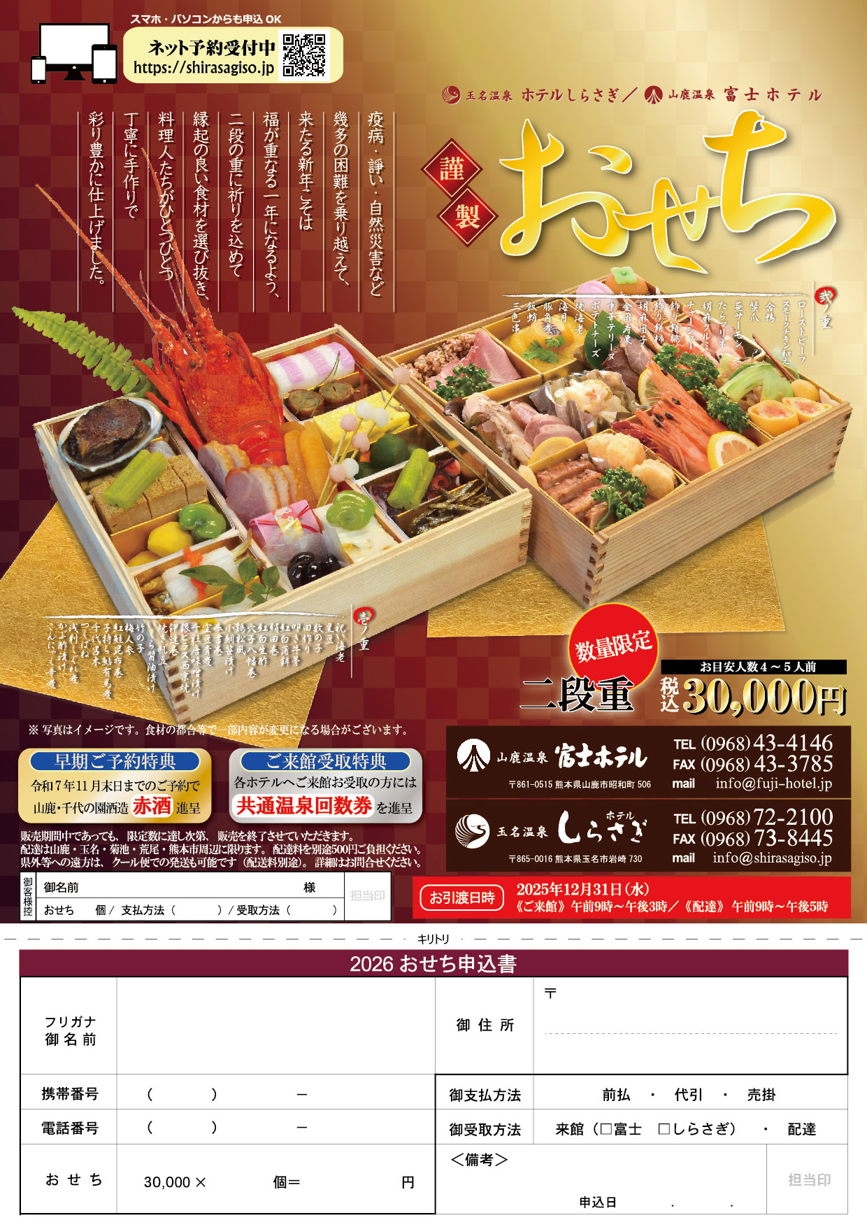 昨年同様、グループの山鹿温泉富士ホテルとの共同調理でお届けします。